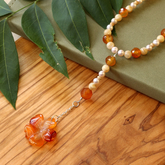 Carved Carnelian Flower Drop Necklace with Pearl & Mother of Pearl Shell