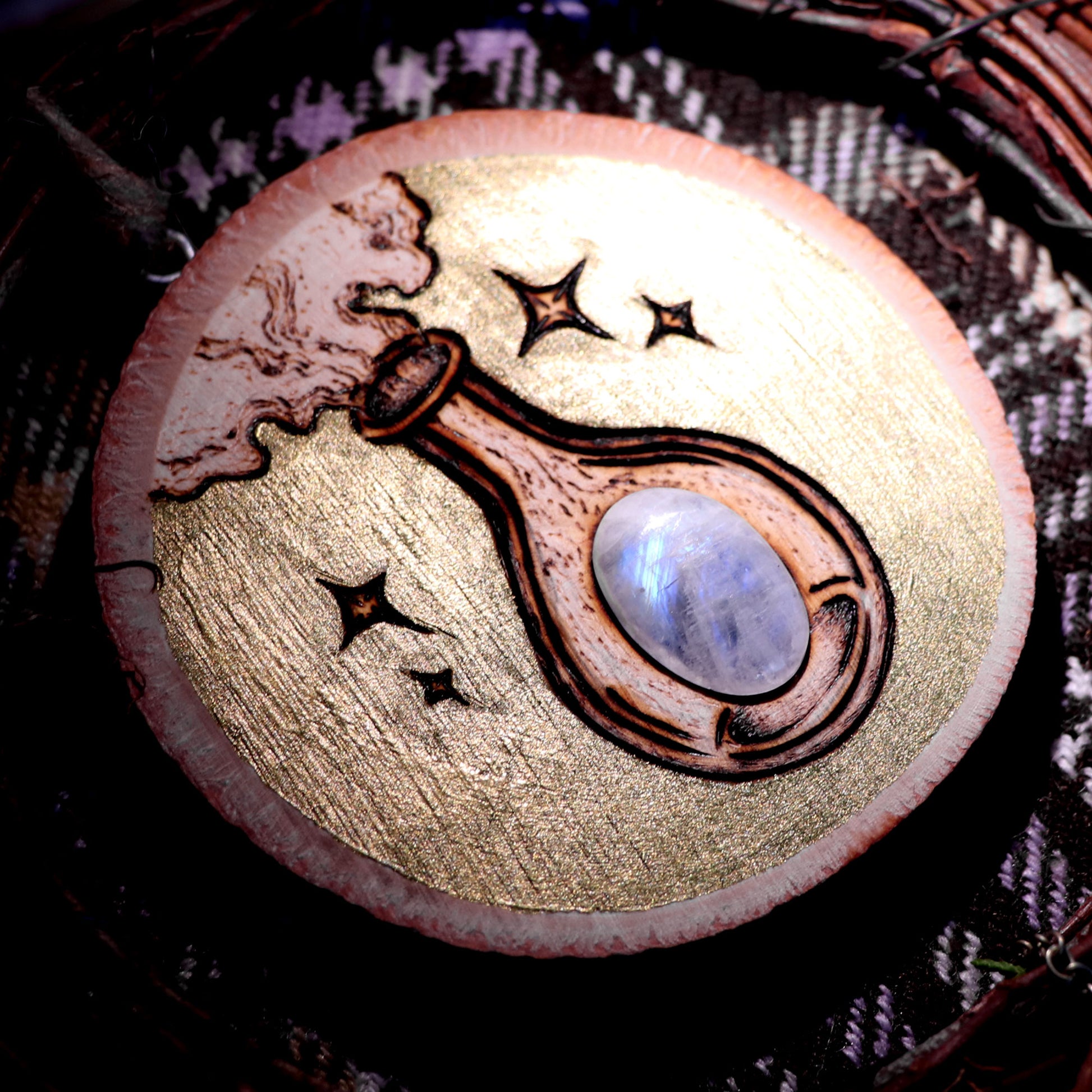 One of the most magical gemstones on earth is moonstone. I created this woodburn and thought the most enchanting object I'd like to find in a bottle is a moonstone. This piece is adorned with a green aventurine mushroom and a metal leaf and painted with beautiful green iridescent shiny paint.