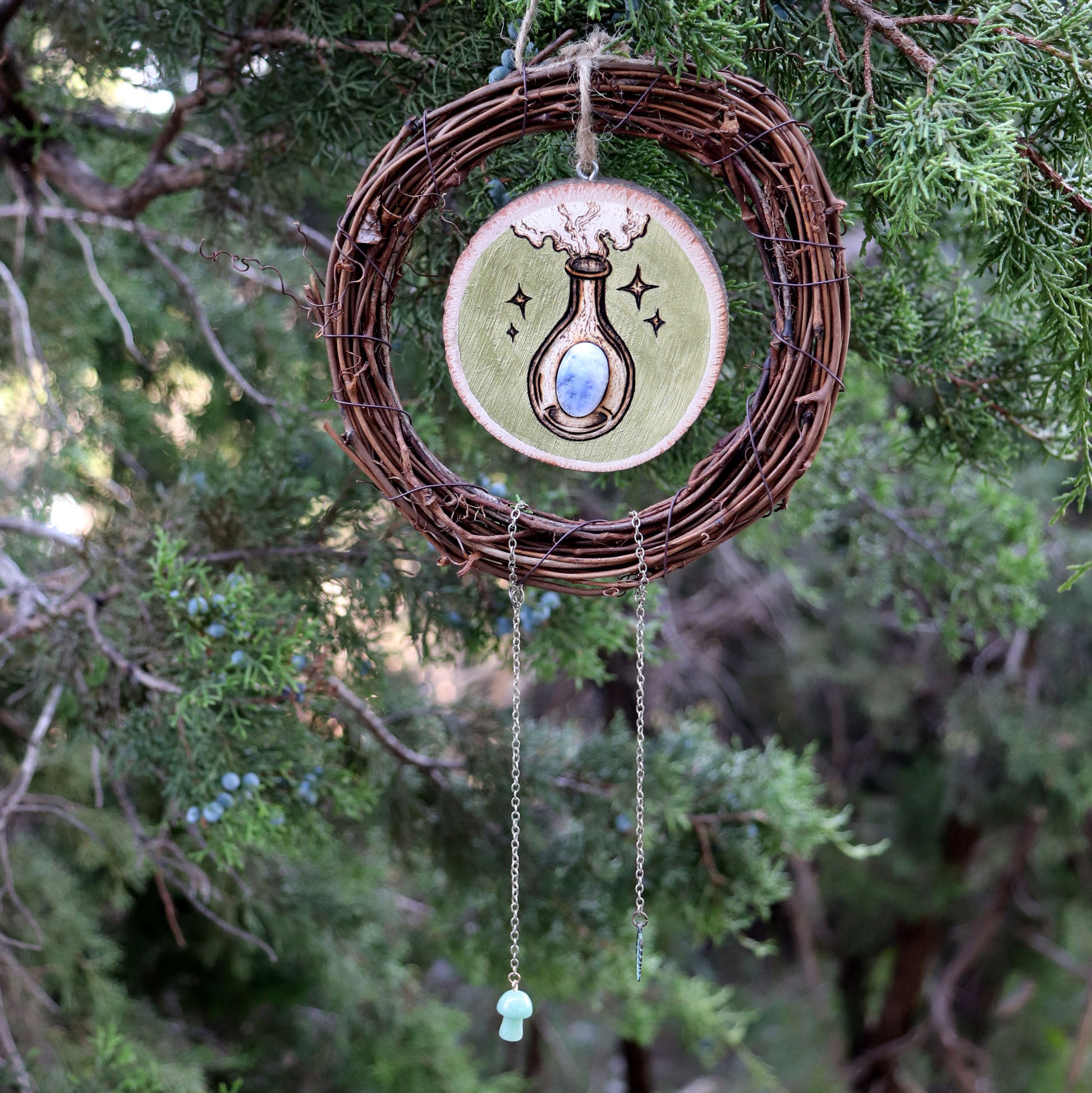 Materials: Vine, Bass Wood, Moonstone, Green Aventurine, Metal, Iridescent Paint