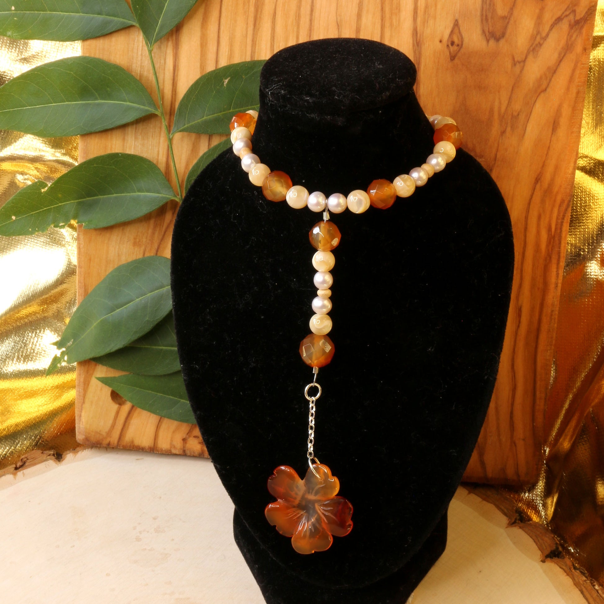 Carved Carnelian Flower Drop Necklace with Pearl & Mother of Pearl Shell